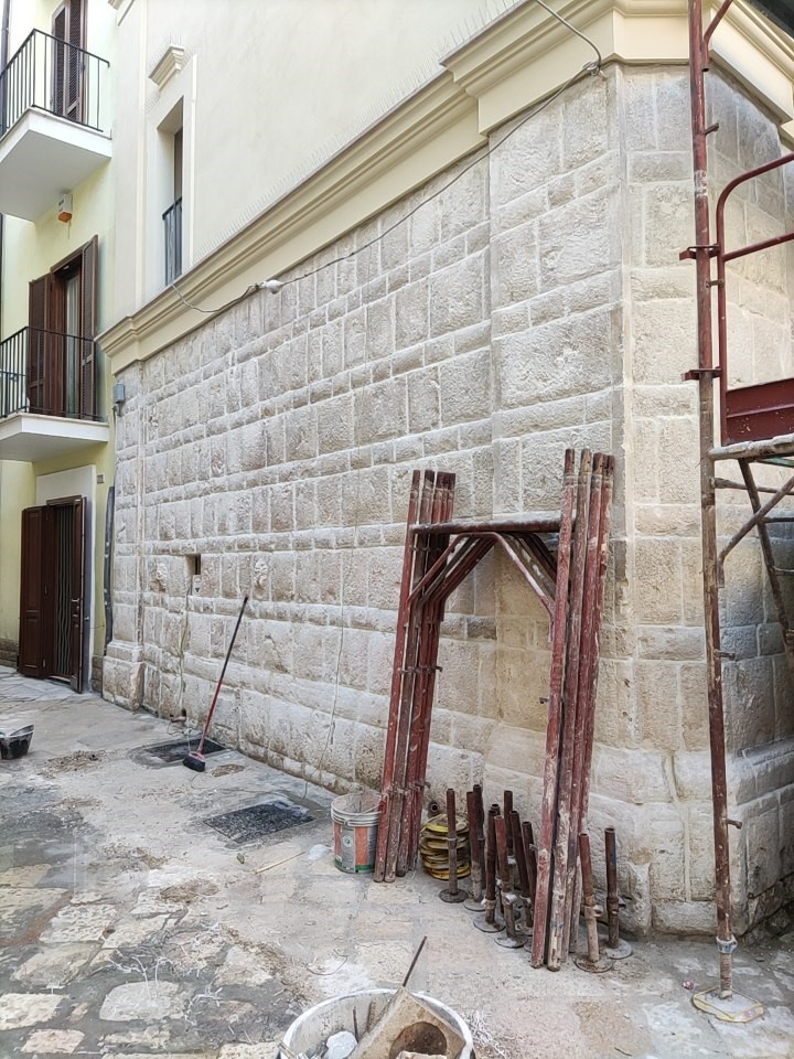 L’intervento ha riguardato il restauro e il risanamento conservativo dell’immobile storico situato in Bari, Largo Maurelli civici 11 e 12, sottoposto a vincolo architettonico da parte della Soprintendenza Archeologia, Belle Arti e Paesaggio per la Città Metropolitana di Bari. L’edificio, caratterizzato da murature portanti in pietra calcarea locale e orizzontamenti di antica fattura, presentava un quadro di degrado diffuso riconducibile alla vetustà delle strutture, all’umidità di risalita, al deterioramento dei solai e all’assenza di impianti idonei alla nuova destinazione d’uso. La committenza intendeva trasformare l’immobile in una struttura ricettiva collegata all’attività di un’agenzia marittima, rendendo necessario un insieme coordinato di interventi strutturali, impiantistici e di recupero architettonico.